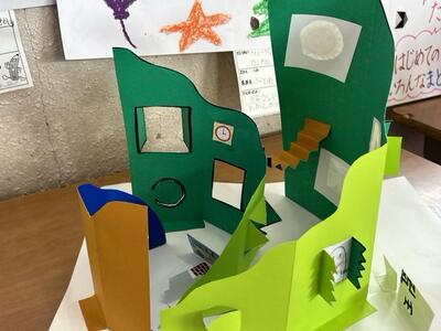 2年生が、図工で、色々な家を作っていました。しばらく眺めていましたが、どの家にも入ってみたいなあと思いました。