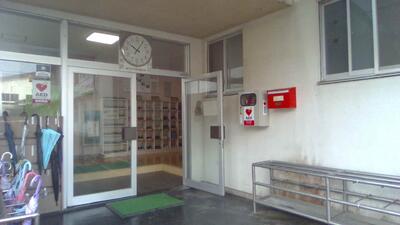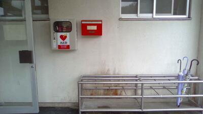 本校のAEDは、これまで校舎内にありました。より多くの方々に使用していただくために、ADEの設置場所を、本日から、玄関前にしました。