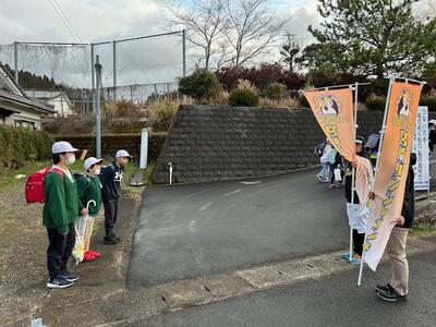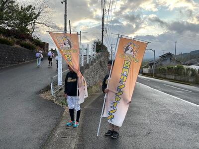 プロ野球チーム(独立リーグ)「宮崎サンシャインズ」のみなさんが、2月19日(月)の朝、あいさつ運動を県道33号線(校門前)でされました。19日は2人でしたが、22日と29日は3人であいさつ運動をされるそうです。