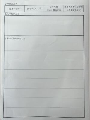 子供たちは、「自分が初めて口にした言葉」「幼稚園や保育園での思い出」「小学校に入学した時に思ったこと」などを、まとめていました。途中、質問がある児童は、先生の周りに集まって質問をしていました。