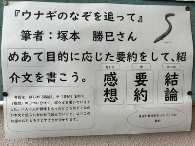 4年生の掲示板には、国語「うなぎのなぞを追って」の要約文が掲示してありました。自分の興味をもった箇所を中心にして、はじめ・なか・おわり の構成でまとめていました。