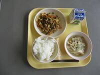 今日の給食は、ごはん、牛乳、コーンと野菜のスープ、鶏肉とゴーヤの揚げ煮でした。