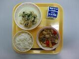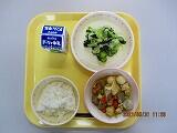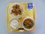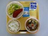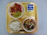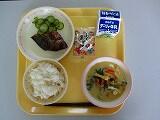 本日の給食は、ごはん、牛乳、さつまいもとほうれん草の味噌汁、鶏肉のバーベキューソース、きゅうりとにんじんのそえもの、でした。