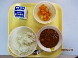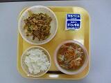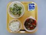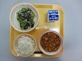 本日の給食は、ごはん、牛乳、マーボーどうふ、もやしとささみのあえもの、でした。