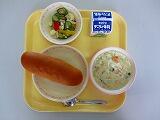 本日の給食は、チーズパン、牛乳、ミネストローネ、はるキャベツとウインナーのソテー、でした。