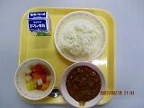 本日の給食は、かつおカレー、むぎごはん、牛乳、フルーツカクテル、でした。