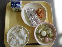 今日の給食は、牛乳、ごはん、芋の子汁、豚肉と野菜の生姜炒め、一色小佃煮でした。
