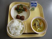 今日の給食は、牛乳、ごはん、ほうとう、きんぴらの肉団子、きゅうりとニンジンの和えものでした。
