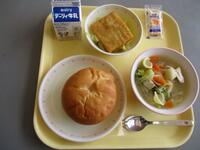 今日の給食は、牛乳、チーズパン、ポトフ、フルーツ白玉でした。