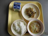 今日の給食は、牛乳、ごはん、とんこつに、千草和えでした。