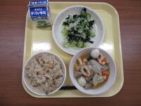 今日の給食は、牛乳、五目釜飯、おでん、ちりめん酢の物でした。