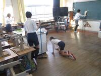 最近、晴れの日が続いており、午前中、窓を開けると涼しい風が入ってきます。今日の1時間目には、6年生が校長先生と一緒に体育館で体育の授業をしました。器械運動を行う前に、2人組になって、関節を伸ばしながら念入りに柔軟体操を行いました。柔軟体操が終わった後は、高い位置からの前転をしました。みんな上手に回転することができていました。