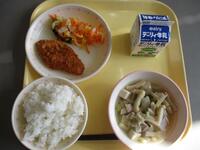 今日の給食は、牛乳、ごはん、野菜スープ、揚げ鳥のオーロラ煮でした。