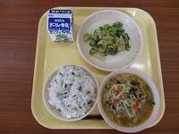 今日の給食は、牛乳、げんりょう青菜ごはん、焼き豚ラーメン、枝豆サラダでした。