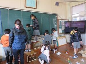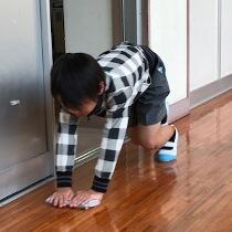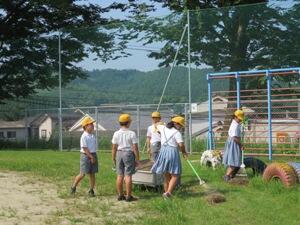 もたちは机を運ぶ(腹筋・背筋)、ぞうきんをしぼる(握力)、草ぬき