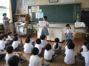 紙しばいの発表をしました。1年生に宮村小学校の校舎内、運動場、安