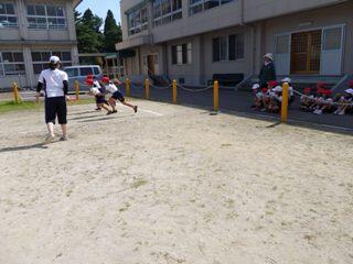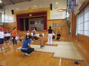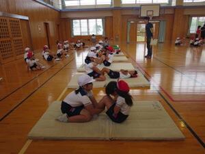 上体起こし、立ち幅跳びの3種目を行いました。上学年と下学年で