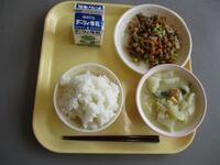 今日の給食は、牛乳、ごはん、わかめスープ、チンジャオロースでした。