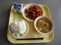 今日の給食は、牛乳、ごはん、キムタクごはんの具、じゃこだんご汁、ふわっとショコラでした。