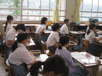 朝から青空が広がり、今日も日中は暑くなりそうです。6年生の教室では、「涼しく過ごすための工夫」について、家庭科の授業で学習をしています。1年生の教室では、空書きで、先生と一緒に書き順を確認しながら、カタカタの練習をしています。7月も中旬に入り、益々エアコンがないと厳しい暑さになってきました。ご家庭でも、エアコン等を上手に使いながら、体調を整えていただき、元気に学校に登校してきてほしいと思います。
