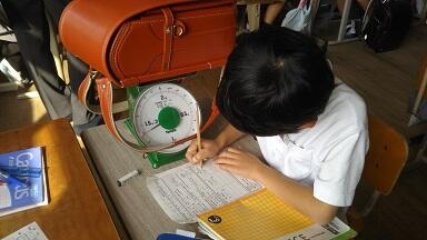 実際にランドセルをはかりの上において重さの勉強をしたり、