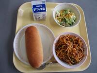 今日の給食は、牛乳、減量コッペパン、ミートスパゲティ、コーンサラダでした。