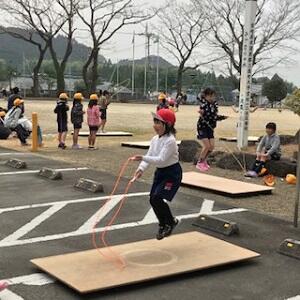 本校の子どもたちの今のブームは縄跳びです。これまで1台しかなかったジャンピングボードを新たに6台作製し、学年1台配当したところ、登校後や昼休み時間に積極的に縄跳びに取り組む子どもたちが増えました。また、跳べる技も増えているようです。