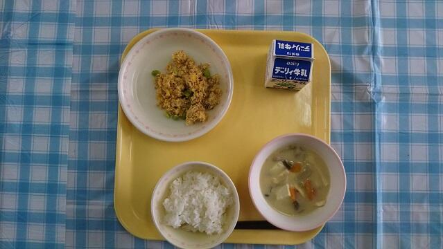 今日の給食は、「アジそぼろ丼」「とうにゅう味噌汁」です。