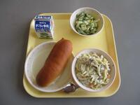 今日の給食は、牛乳、減量黒糖パン、シーフードクリームスパゲティ、カラフルサラダでした。