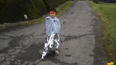 寒さ防止のアルミシートで身をくるみ、
