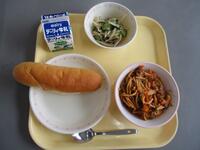 今日の給食は、げんりょうミルクパン、牛乳、ナスのミートスパゲティ、カミカミサラダでした。