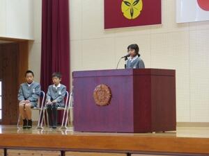 始業式では、2、4、6年生が作文発表しました。2年生は冬休みの楽しかったことと3年生に向けて3学期にがんばることを大きな声で発表できました。冬休みに作文を書く、発表練習をするで2回学校に来て練習しました。本番が1番よくできていました。度胸があってすばらしいですね。4年生は高学年に向けて、学校や家で取り組むことをすらすら大きな声で言えました。6年生は市町村駅伝に出場して思ったことやこれから自分に生かしていきたいこと、卒業に向けてがんばることを発表しました。最上級生のとしての自覚があってすばらしですね。
