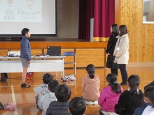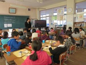 1月19日(木)に給食感謝の集いが行われました。給食センターから学校栄養士の2名の先生、三股中学校から栄養教諭の先生に来校していただきました。給食感謝週間がどうして設定されたのかということ、給食ができるまでにたくさんの方々にお世話になっているということ、日本は世界の中でも残食が多いということなどをプロジェクターで写真を見せながら、話して下さいました。子どもたちは、知らなかったことも多いようで関心が高く、とてもよく見て、聞いていました。