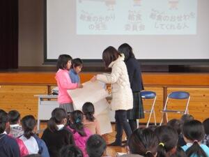 また、給食・保健委員会の6年生の代表が給食センターの先生に感謝の気持ちを込めたお礼の言葉を述べました。堂々とした態度でとても良かったです。