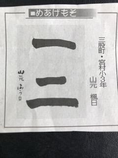 お盆明けの宮崎日日新聞地方版に、本校3年生 山元楓日さんの習字作品が掲載されました。3年生で初めて習った書写の作品です。一生懸命に書いた様子が伝わってきます。