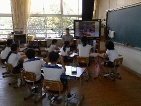 新学期から三股町内の学校にはタブレット端末が配備されました。早速今日の外国語活動の時間では、クリスチャン先生が端末を使いながら授業をしていました。