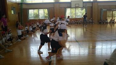体育館に全校児童が集合して、1年生から6年生まで