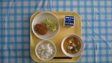 今日の給食は「コーンスープ」「にくじゃがコロッケ」「茹でキャベツ」「ごはん」です。