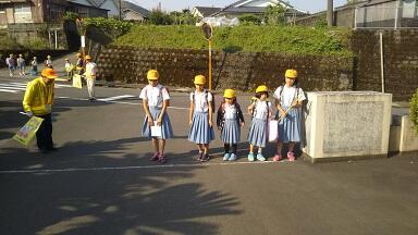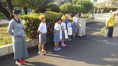まずは、担当の登校班が校門に勢ぞろいし、登校してきた子供達にあいさつします。
