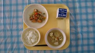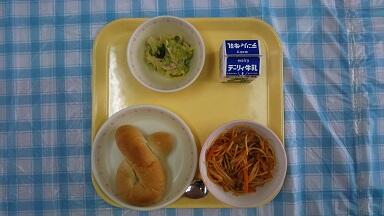 今日の献立は「冬野菜のクリーム煮」「ハムのマリネ」「コッペパン」です。