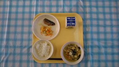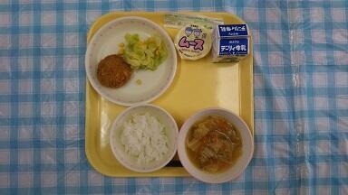 今日の献立は「野菜スープ」「ハンバーグ」「ミルクパン」です。