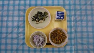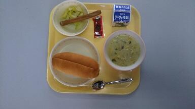 今日の献立は「チーズスープ」「アスパラサラダ」「コッペパン」です。