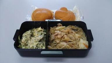 「茹でキャベツと豚バラ肉の甘辛炒め」「スナップエンドウとブロッコリー」「ふりかけ」です。