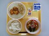 本日の給食は、ごはん、牛乳、やさいスープ、みまたんチキンカツ、カリフラワーとコーンのサラダ、でした。