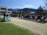 14:46分までは各学級で震災についての話をしましたが、写真は、朝の掃除の様子(外掃除)1年生による、運動場の凧揚げの様子になります。