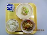 本日の給食は、ごはん、牛乳、とんこつ煮、アーモンド和え、でした。