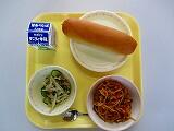 本日の給食は、げんりょうミルクパン、牛乳、なすのミートスパゲティ、カミカミサラダでした。