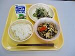 本日の給食は、ごはん、牛乳、ごもくみそしる、豚肉と野菜の甘辛炒め、でした。
