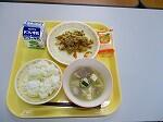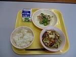 本日の給食は、ごはん、牛乳、さんぺい汁、豚肉と野菜の生姜炒め、みかんクリーム大福、でした。