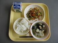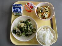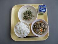 今日の給食は、ごはん、牛乳、大豆の磯煮、ちりめんの酢の物でした。